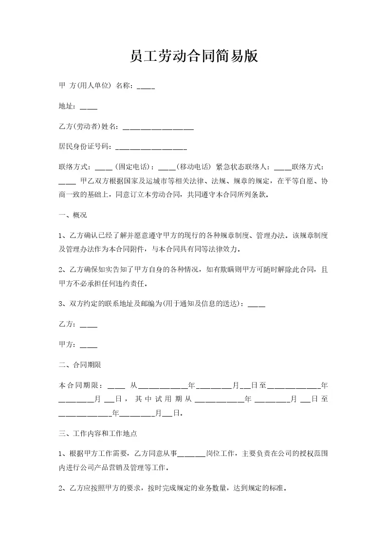 员工劳动合同简易版