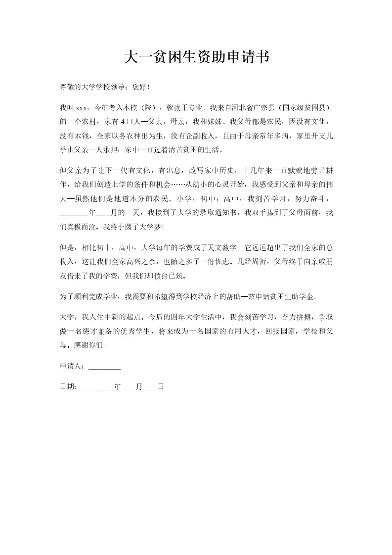 大一贫困生资助申请书