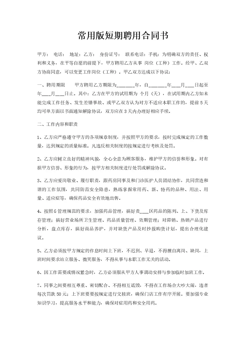 常用版短期聘用合同书