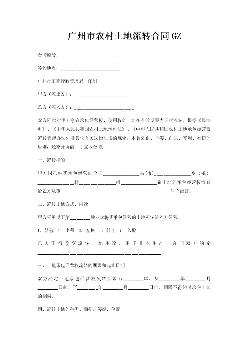 广州市农村土地流转合同GZ
