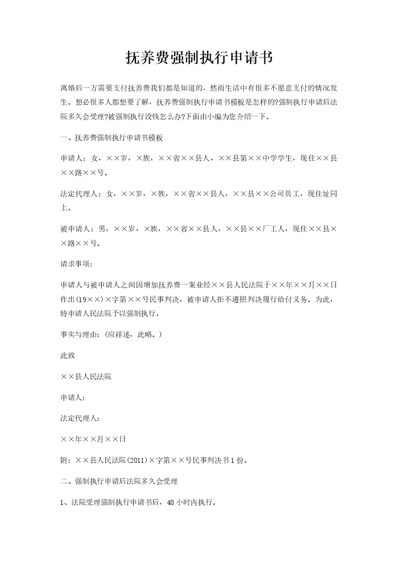 抚养费强制执行申请书