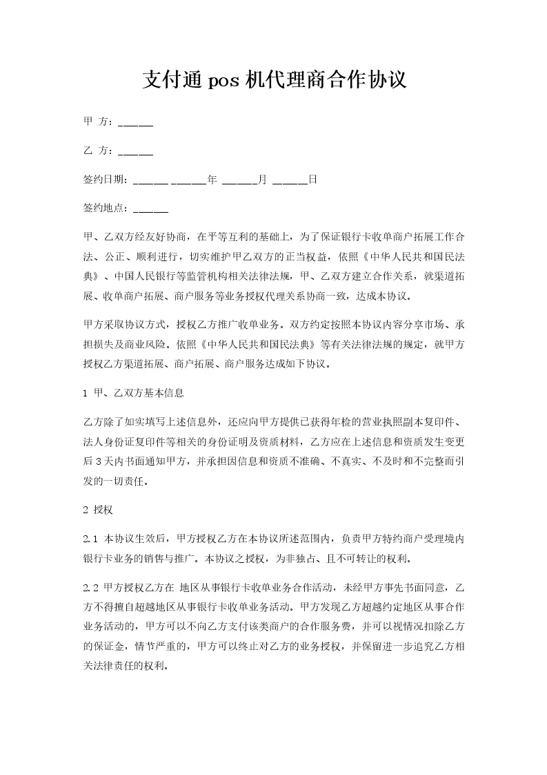 支付通pos机代理商合作协议