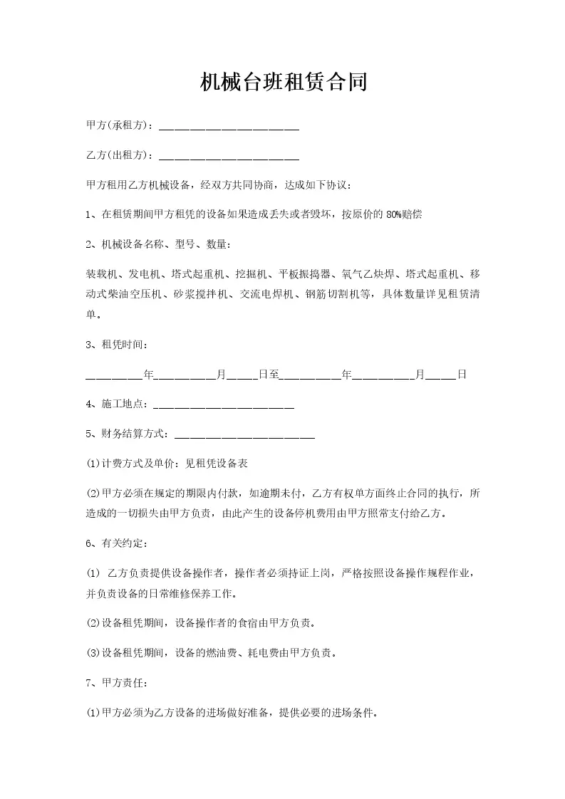 机械台班租赁合同