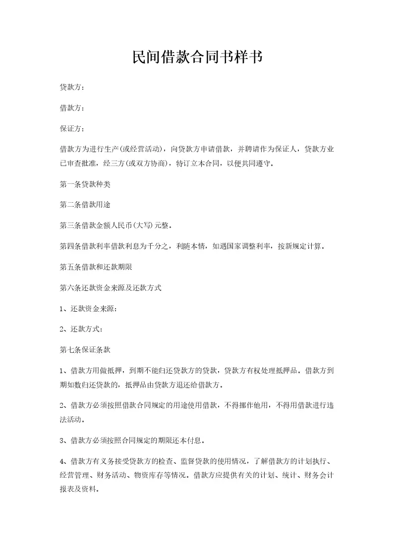 民间借款合同书样书