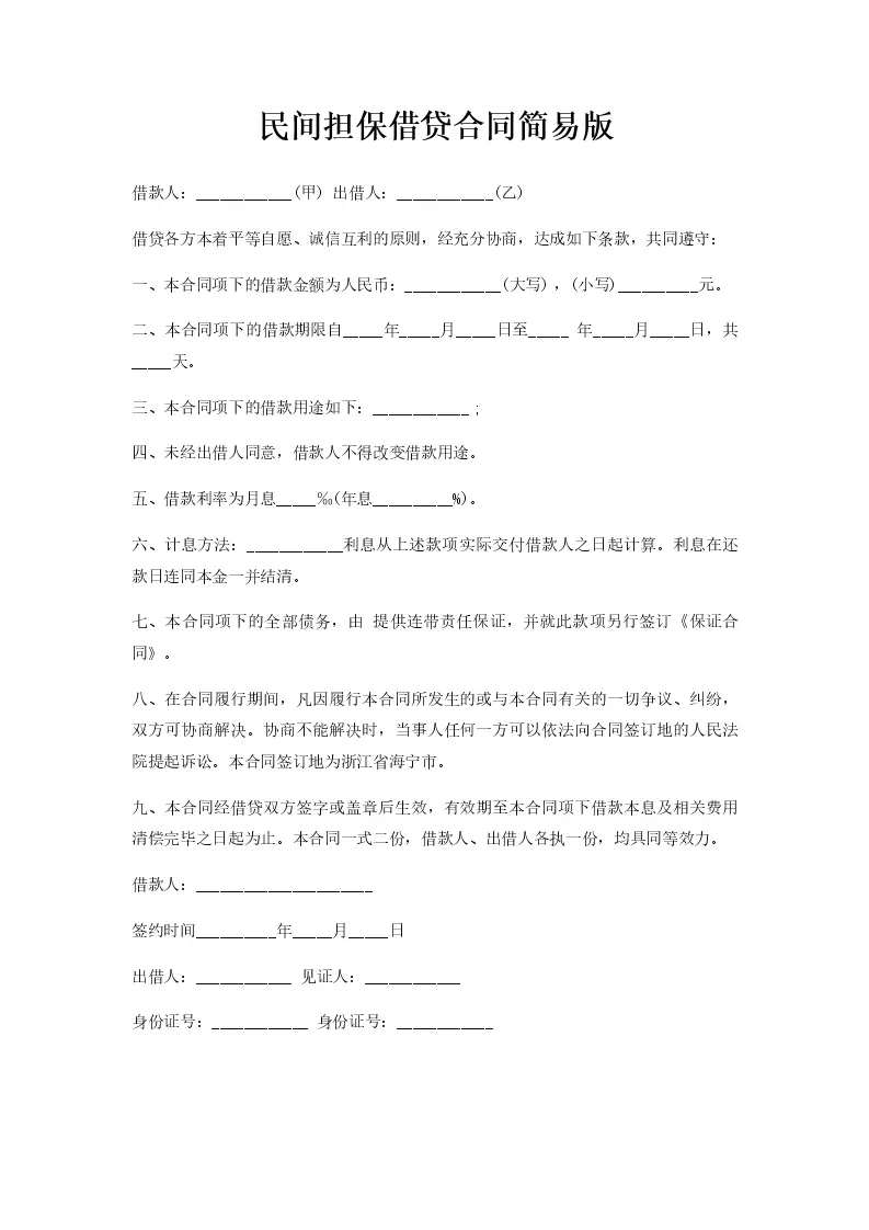 民间担保借贷合同简易版