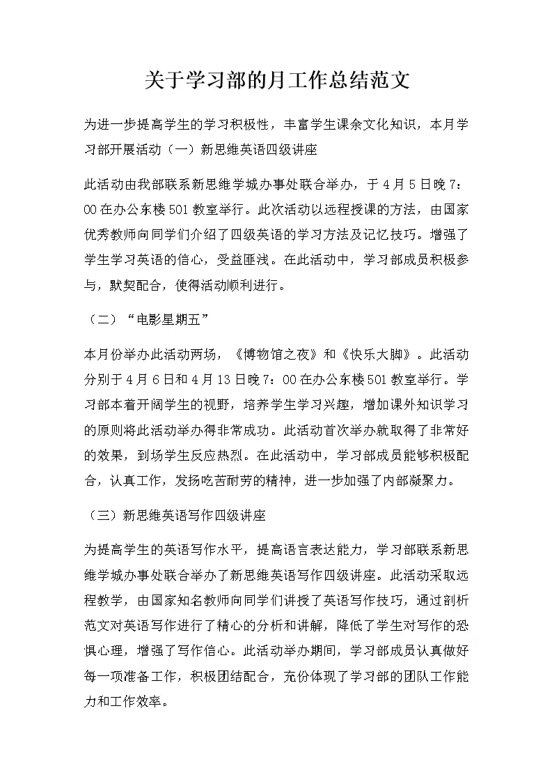 关于学习部的月工作总结范文