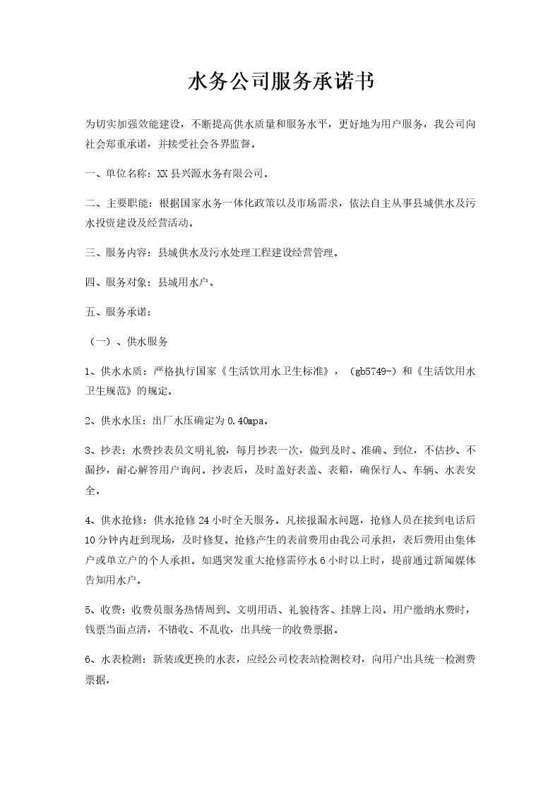 水务公司服务承诺书