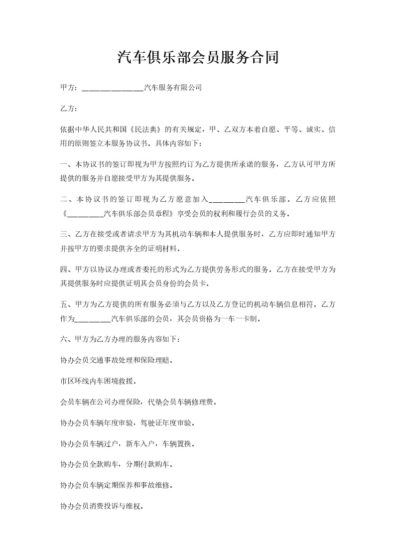 汽车俱乐部会员服务合同
