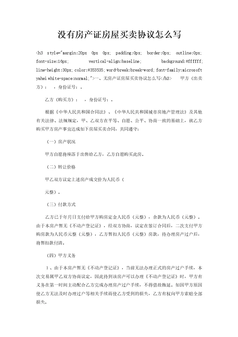 没有房产证房屋买卖协议怎么写
