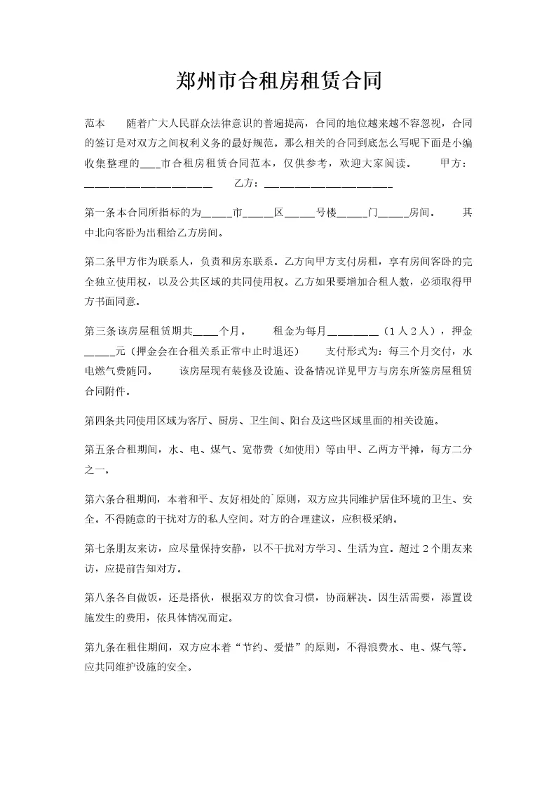 郑州市合租房租赁合同
