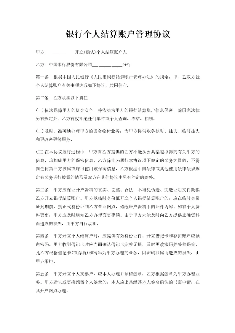 银行个人结算账户管理协议