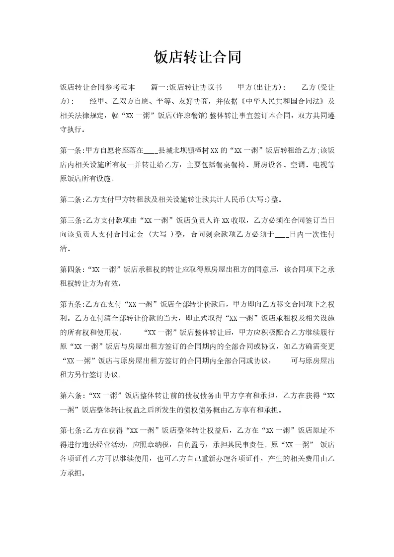 饭店转让合同