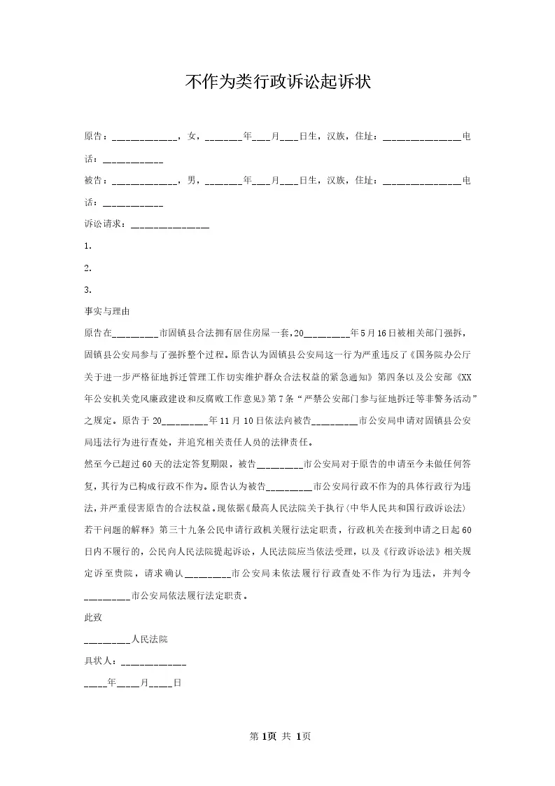 不作为类行政诉讼起诉状