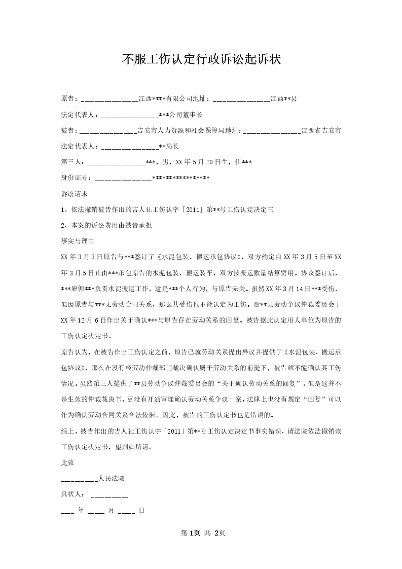 不服工伤认定行政诉讼起诉状