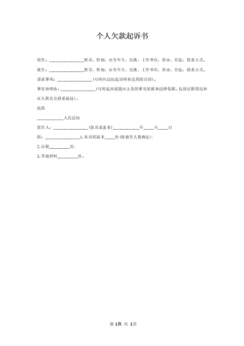 个人欠款起诉书