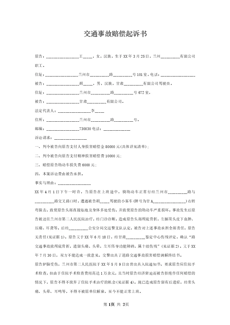 交通事故赔偿起诉书
