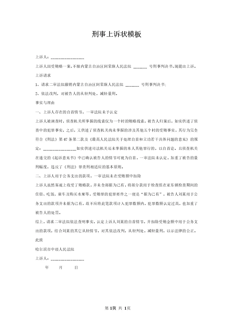 刑事上诉状模板_