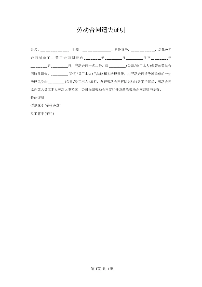 劳动合同遗失证明_