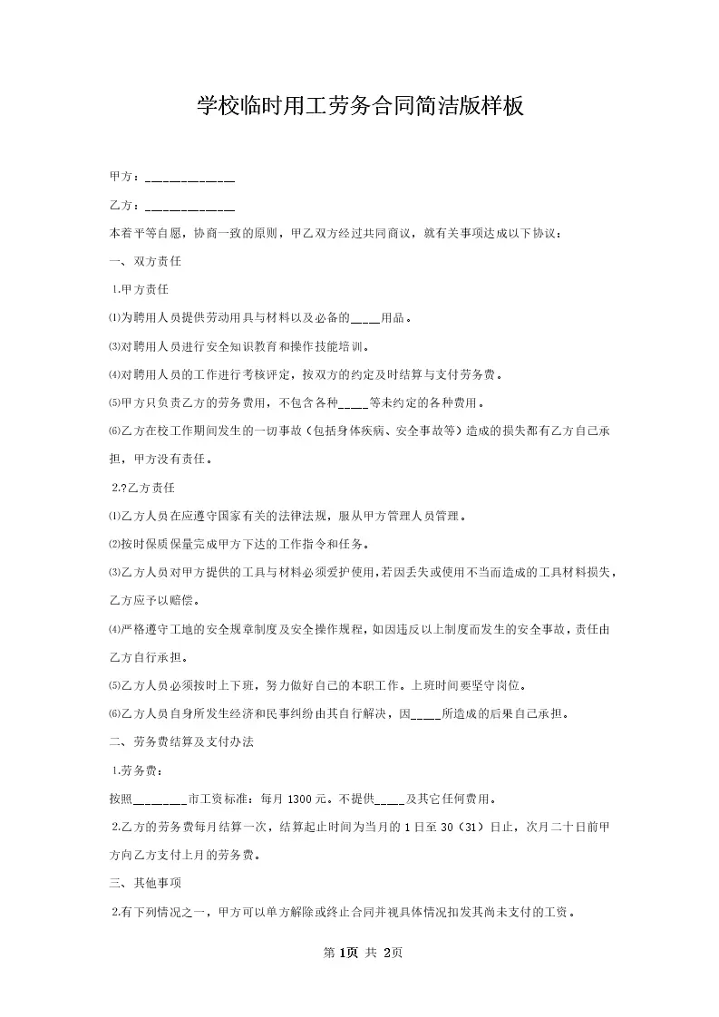 学校临时用工劳务合同简洁版样板