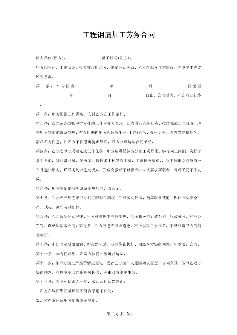 工程钢筋加工劳务合同
