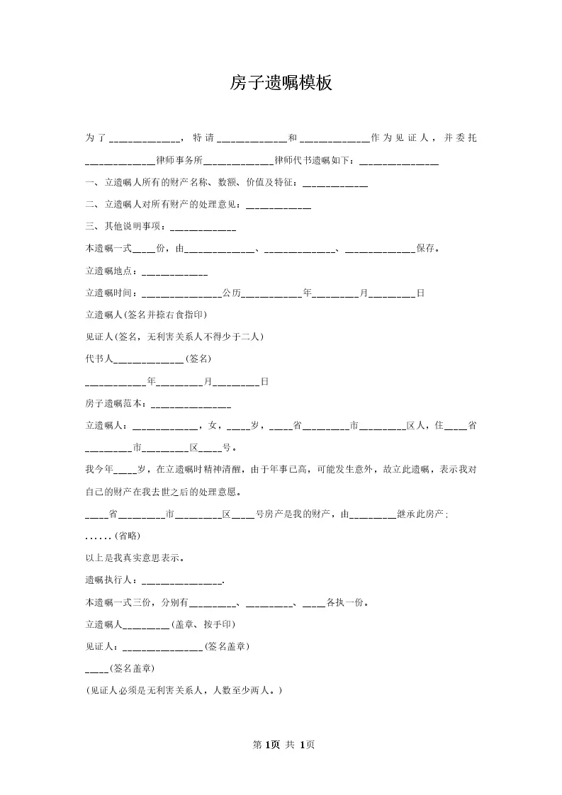 房子遗嘱模板
