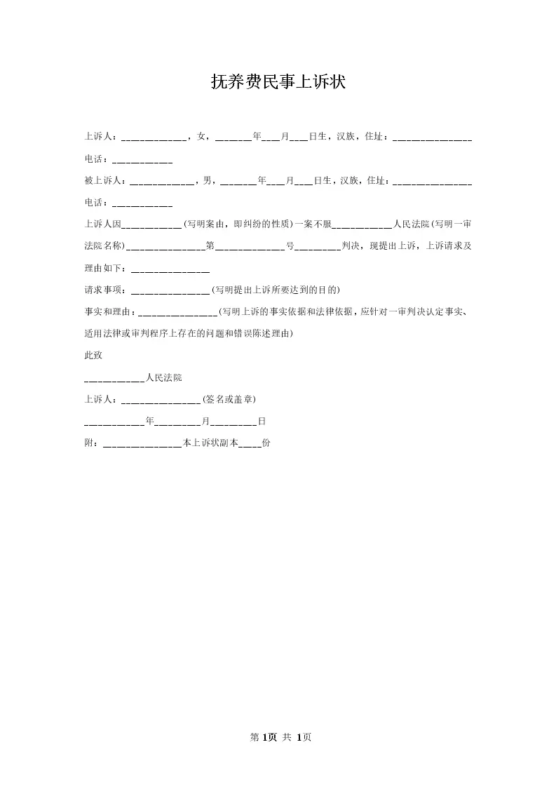 抚养费民事上诉状