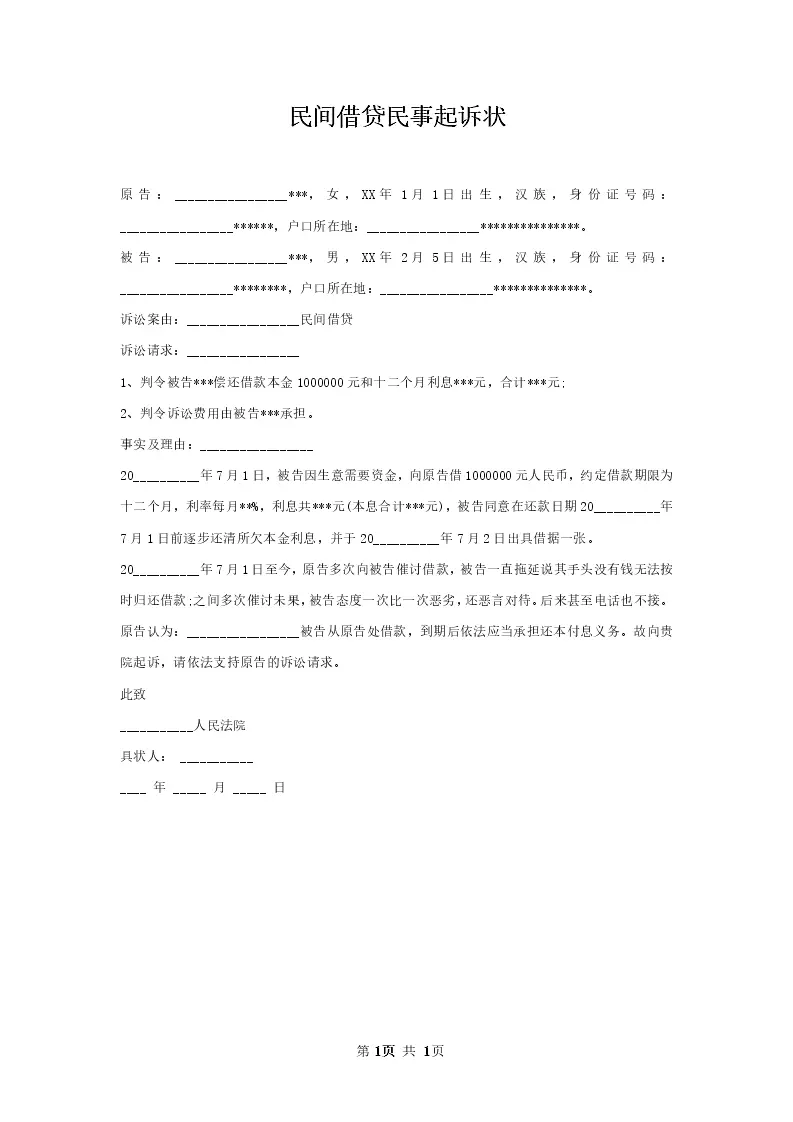 民间借贷民事起诉状