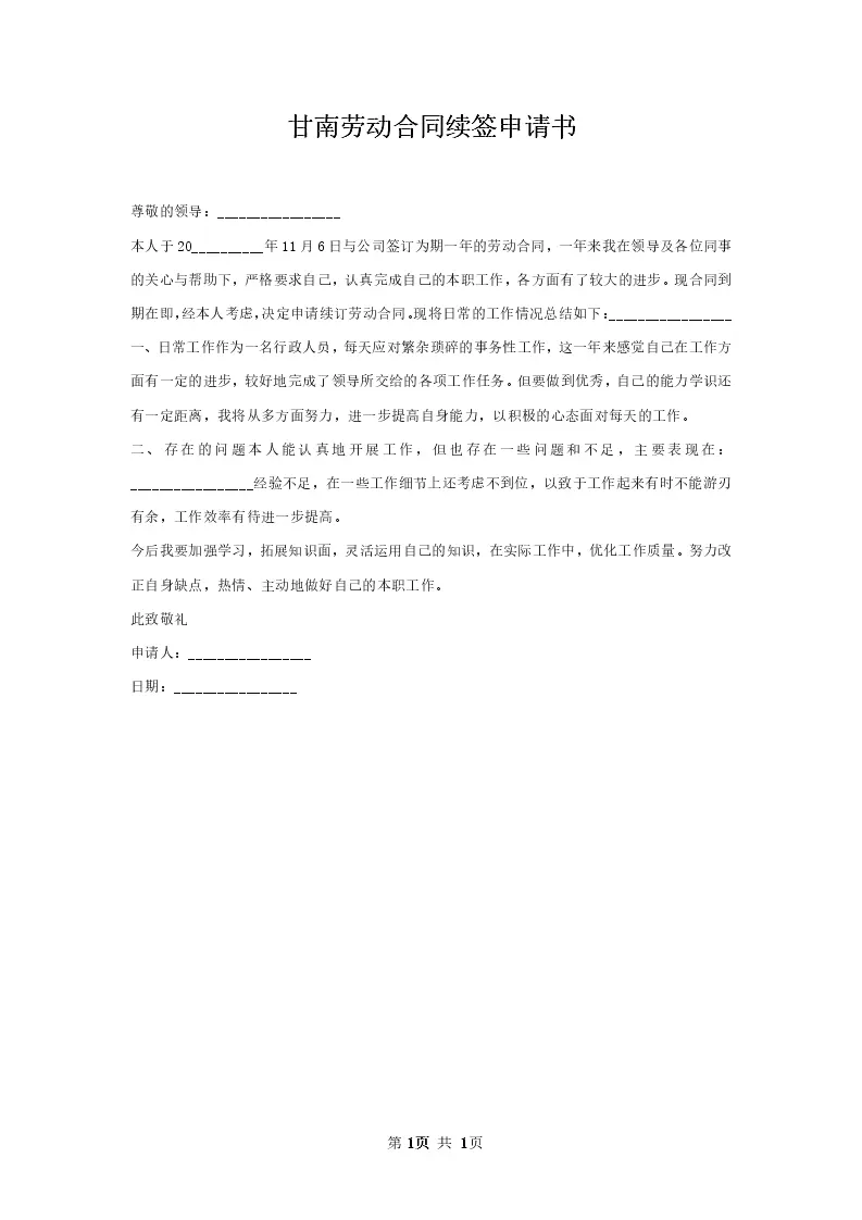 甘南劳动合同续签申请书