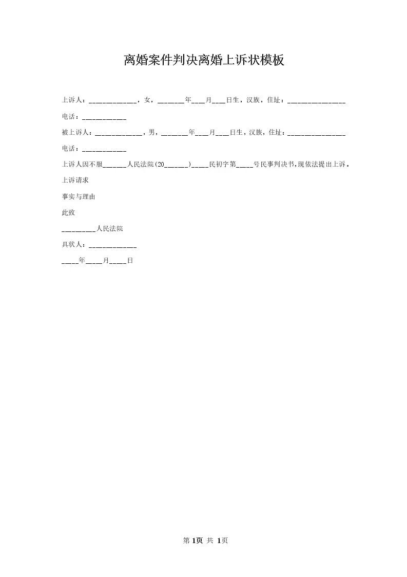 离婚案件判决离婚上诉状模板