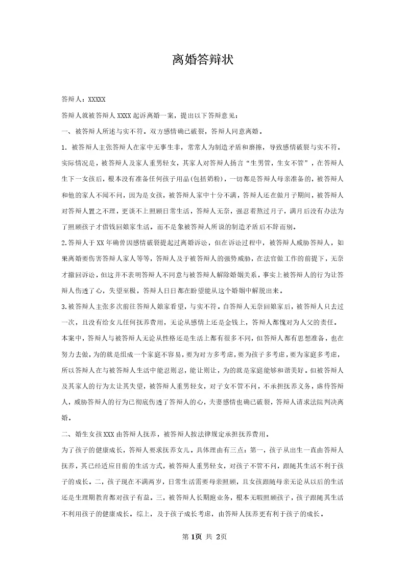 离婚答辩状_