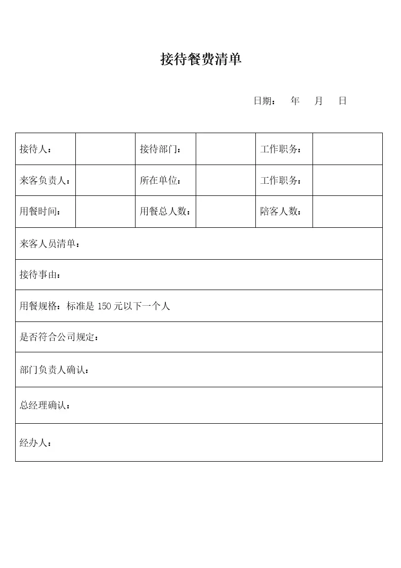 公务接待餐费清单模板