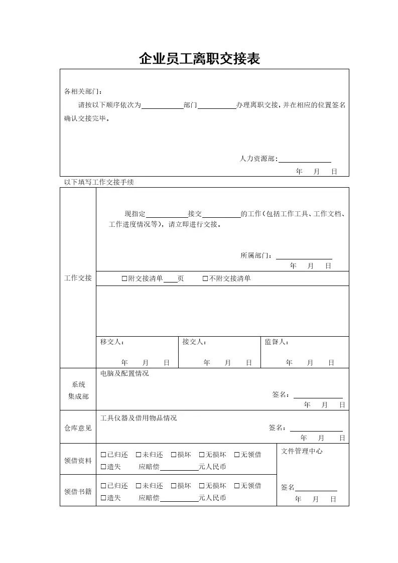 企业员工离职交接表