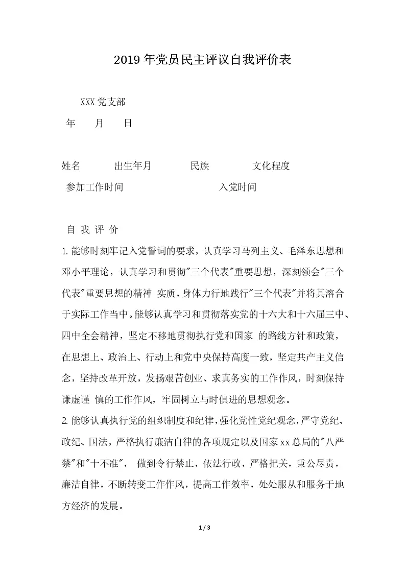 党员民主评议自我评价表