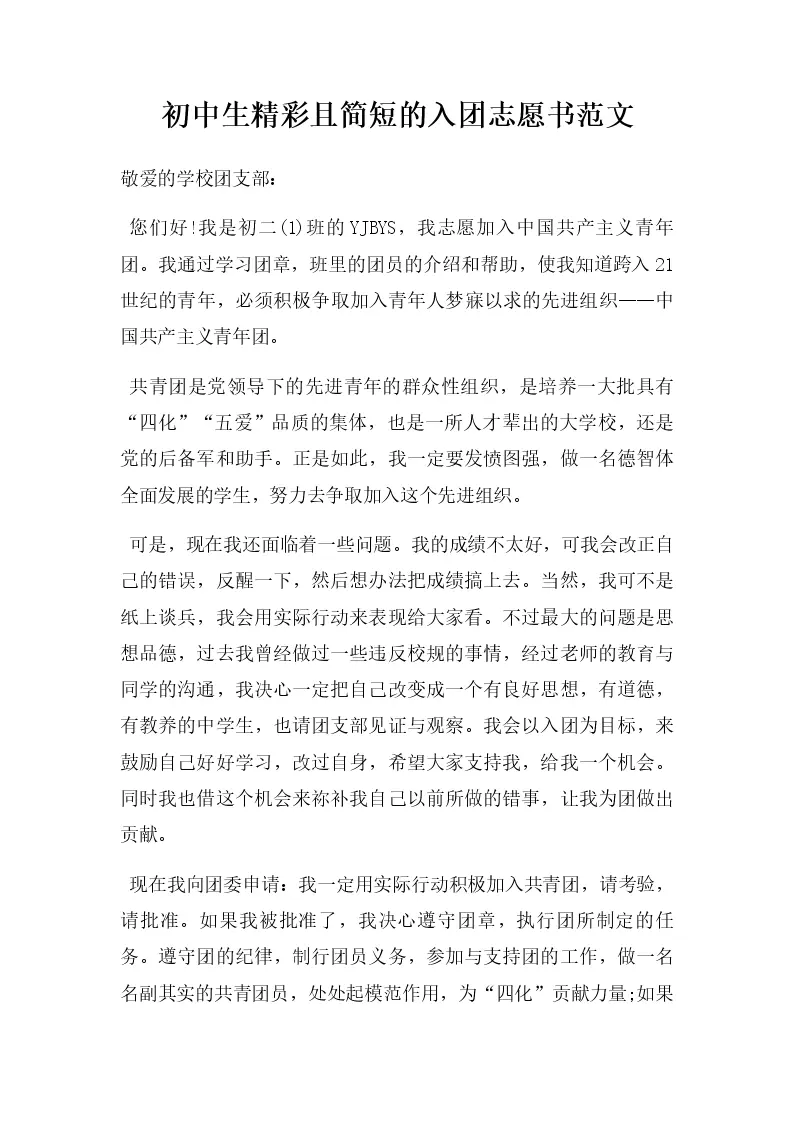 初中生精彩且简短的入团志愿书范文