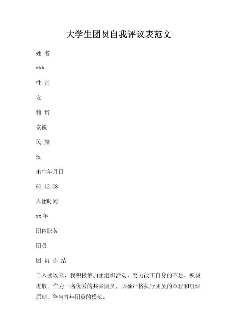大学生团员自我评议...