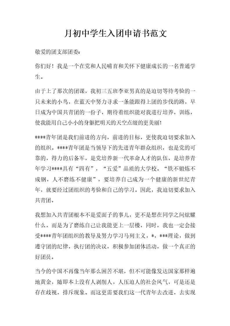 月初中学生入团申请书范文
