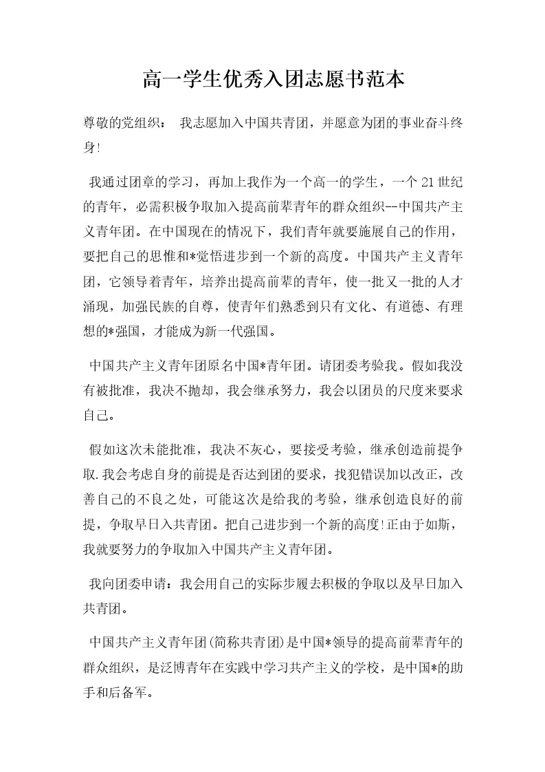 高一学生优秀入团志愿书范本