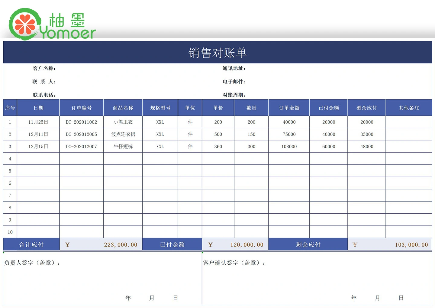 蓝色服装销售对账单Excel模板