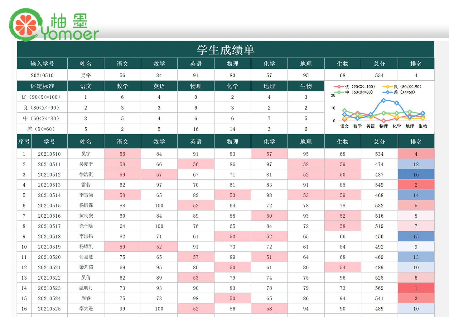 绿色学生考试成绩单