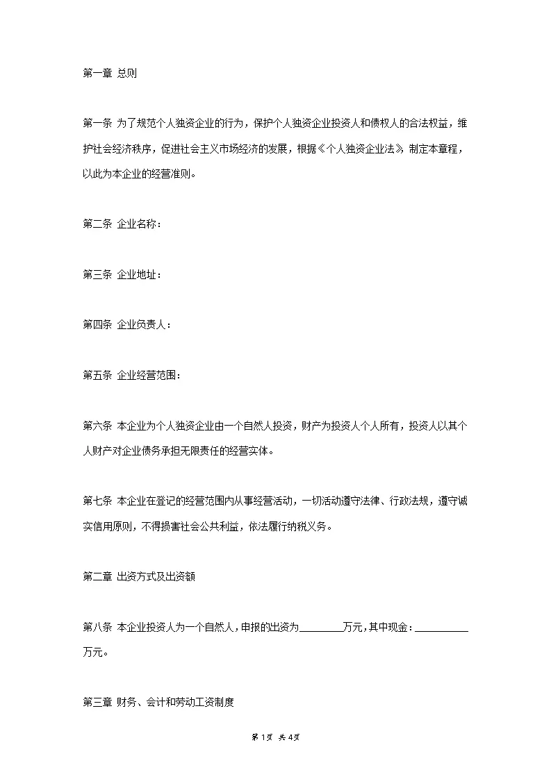 个人独资企业公司章程范本