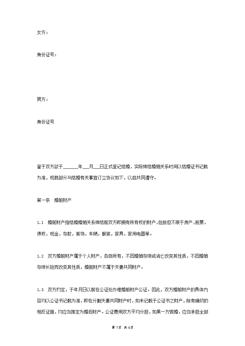 夫妻一方违反忠诚协议的婚前财产协议范本