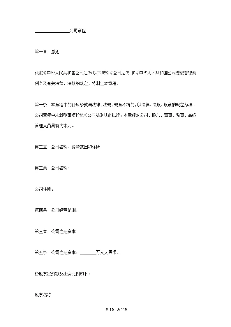 独资有限公司章程范本