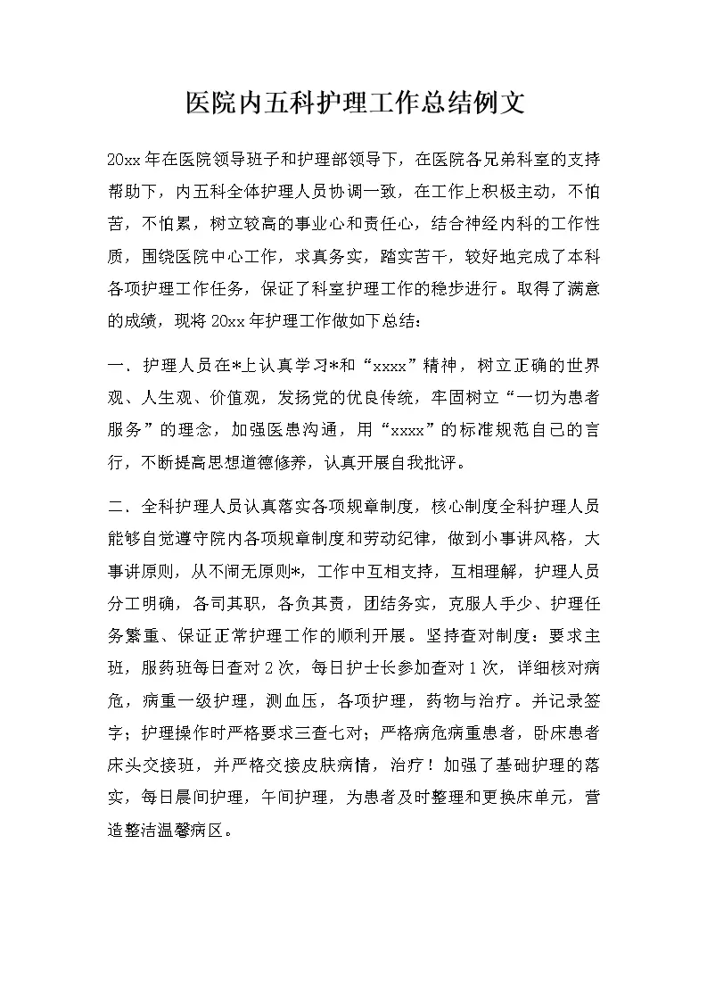 医院内五科护理工作总结例文