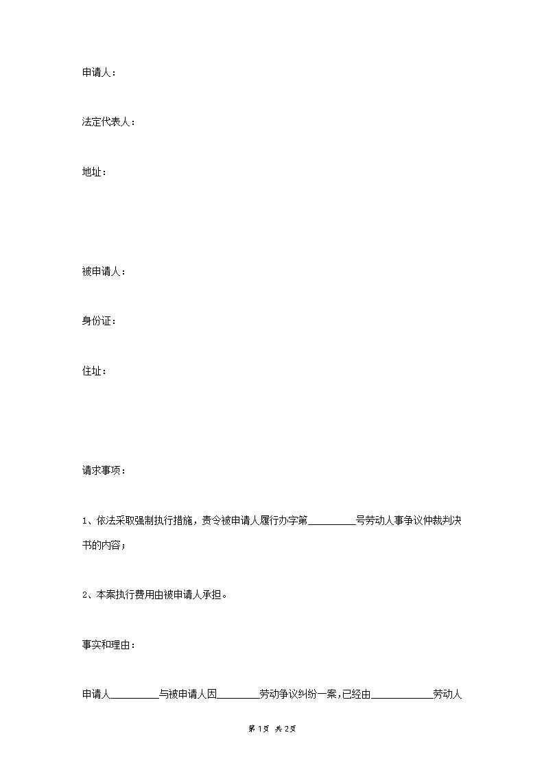 劳动仲裁强制执行申...