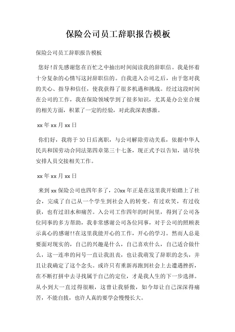 保险公司员工辞职报...