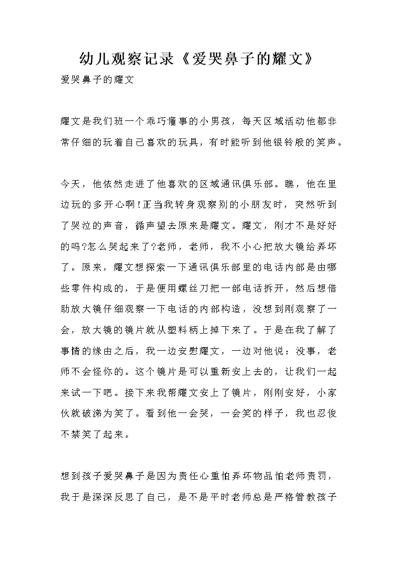 幼儿观察记录《爱哭鼻子的耀文》
