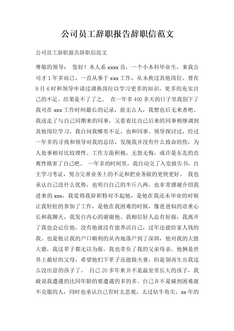 公司员工辞职报告辞职信范文