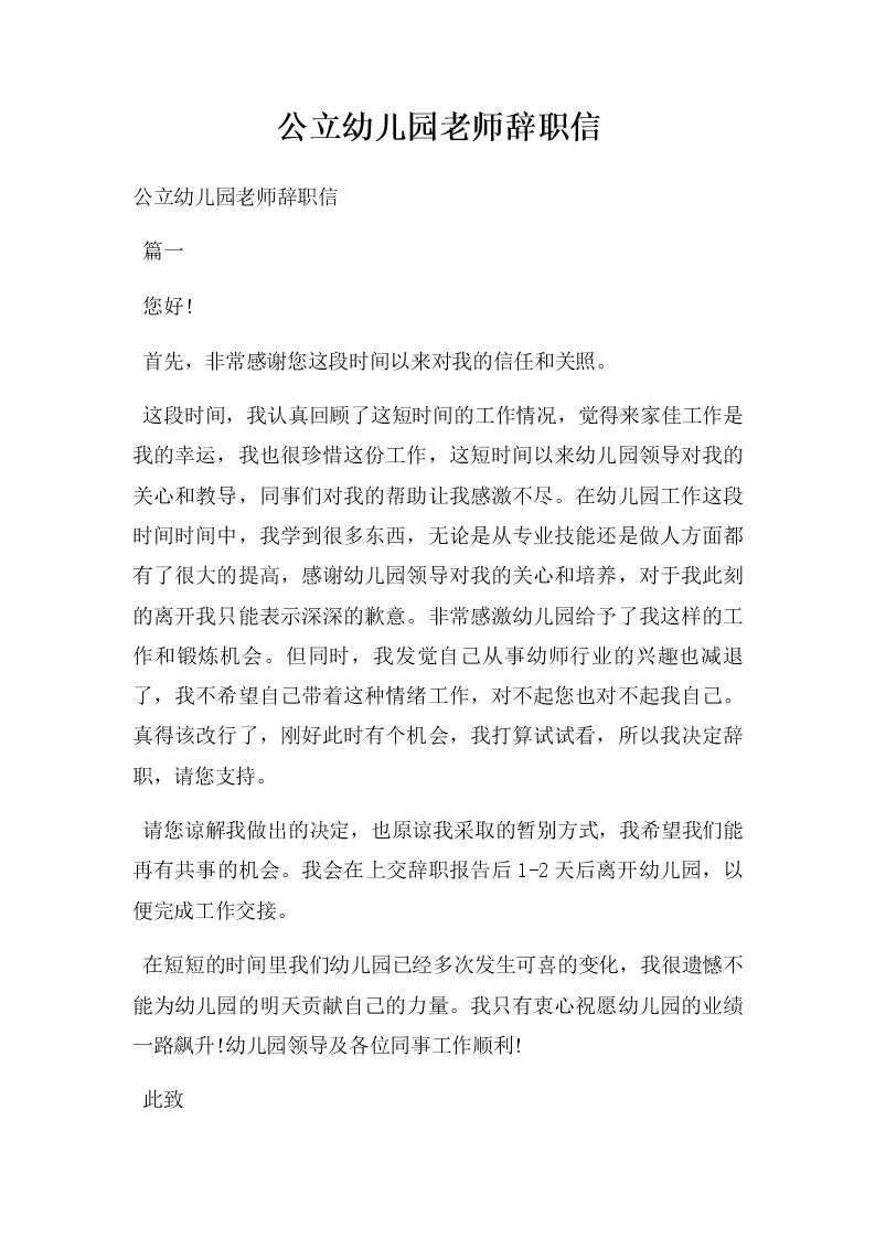 公立幼儿园老师辞职信
