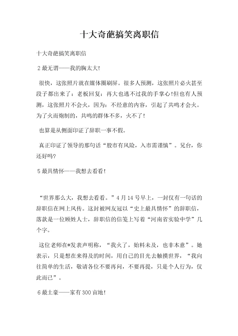 十大奇葩搞笑离职信