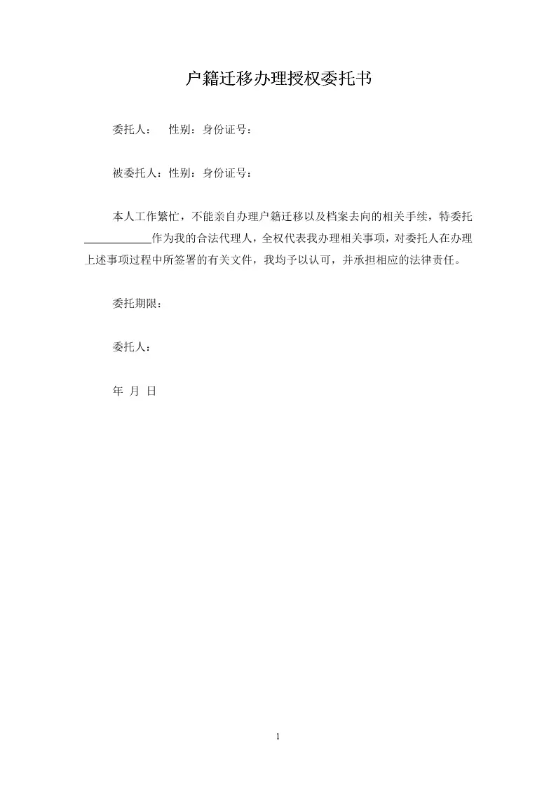 户籍迁移办理授权委...